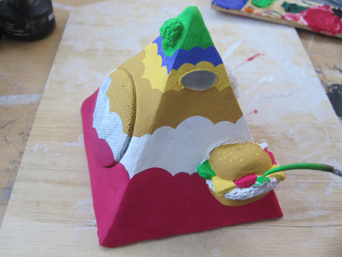 Here is the speaker I did for the Craynial show at Big Umbrealla. I gutted the Boombotix speaker and sculpted a pyramid out of clay. The clay air dries in 24 hours, so no need to worry about firing it in a kiln. The parts are all inside, so technically it could work as a speaker. The eyeball lights up when the power is on too! Now I'm hungry.